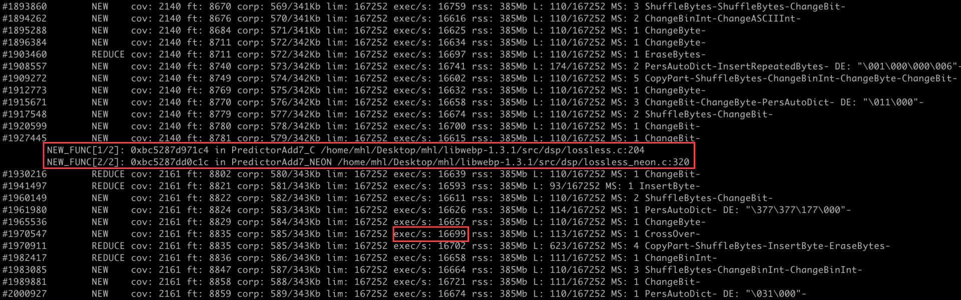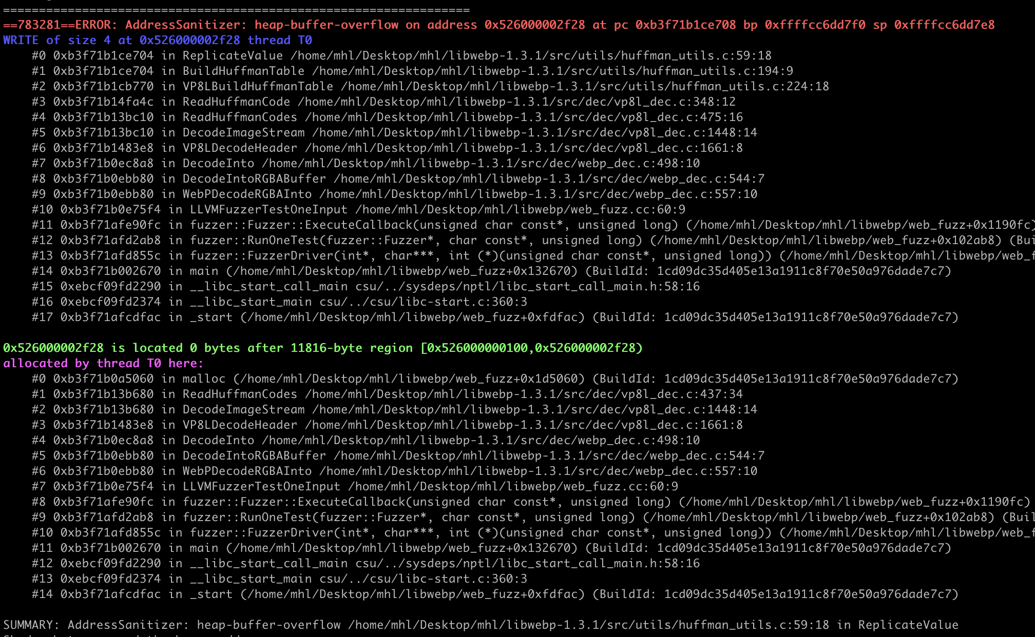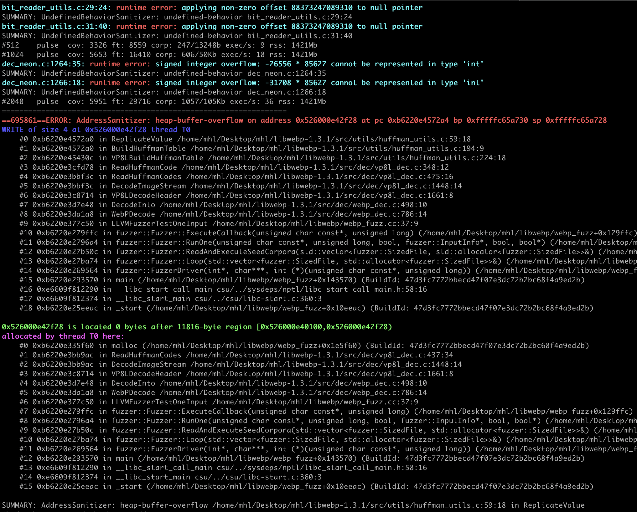 With the refined harness, execution was smoother and consistently reached the lossless (VP8L) code path without OOMs or timeouts. We were also able to reproduce the crash within 2-3 hours.