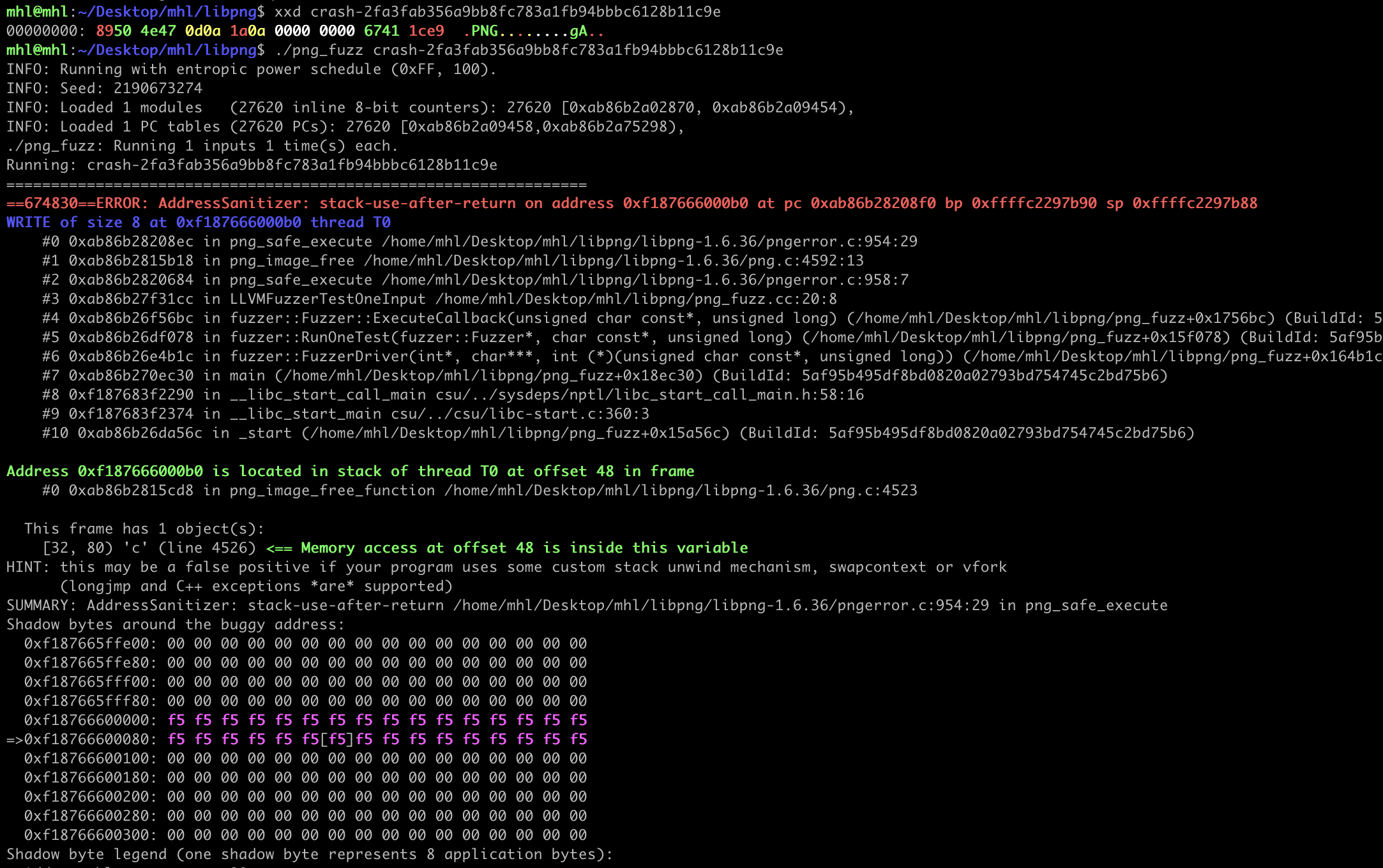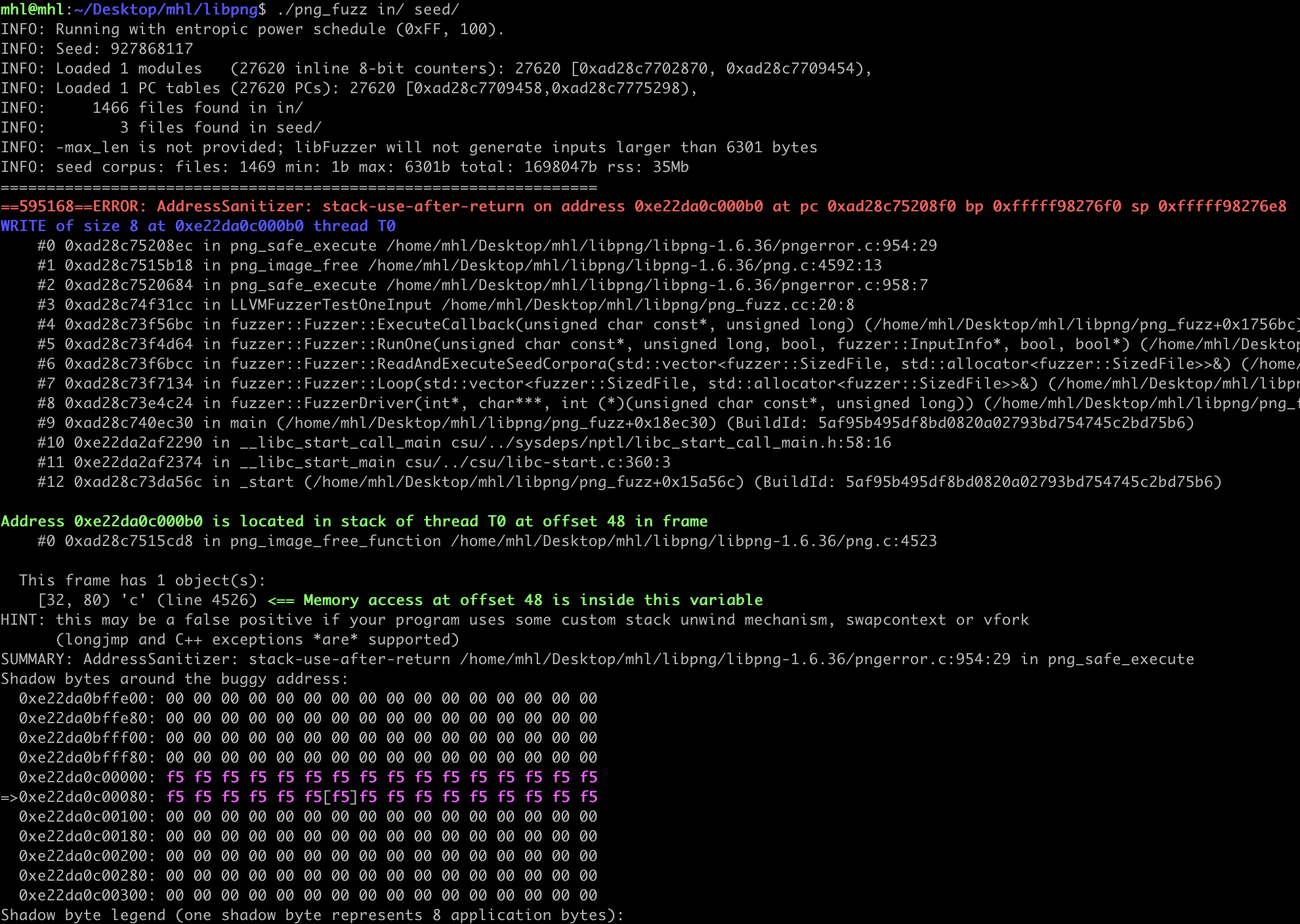 Within a minute, the fuzzer should crash and ASan will produce a report.
