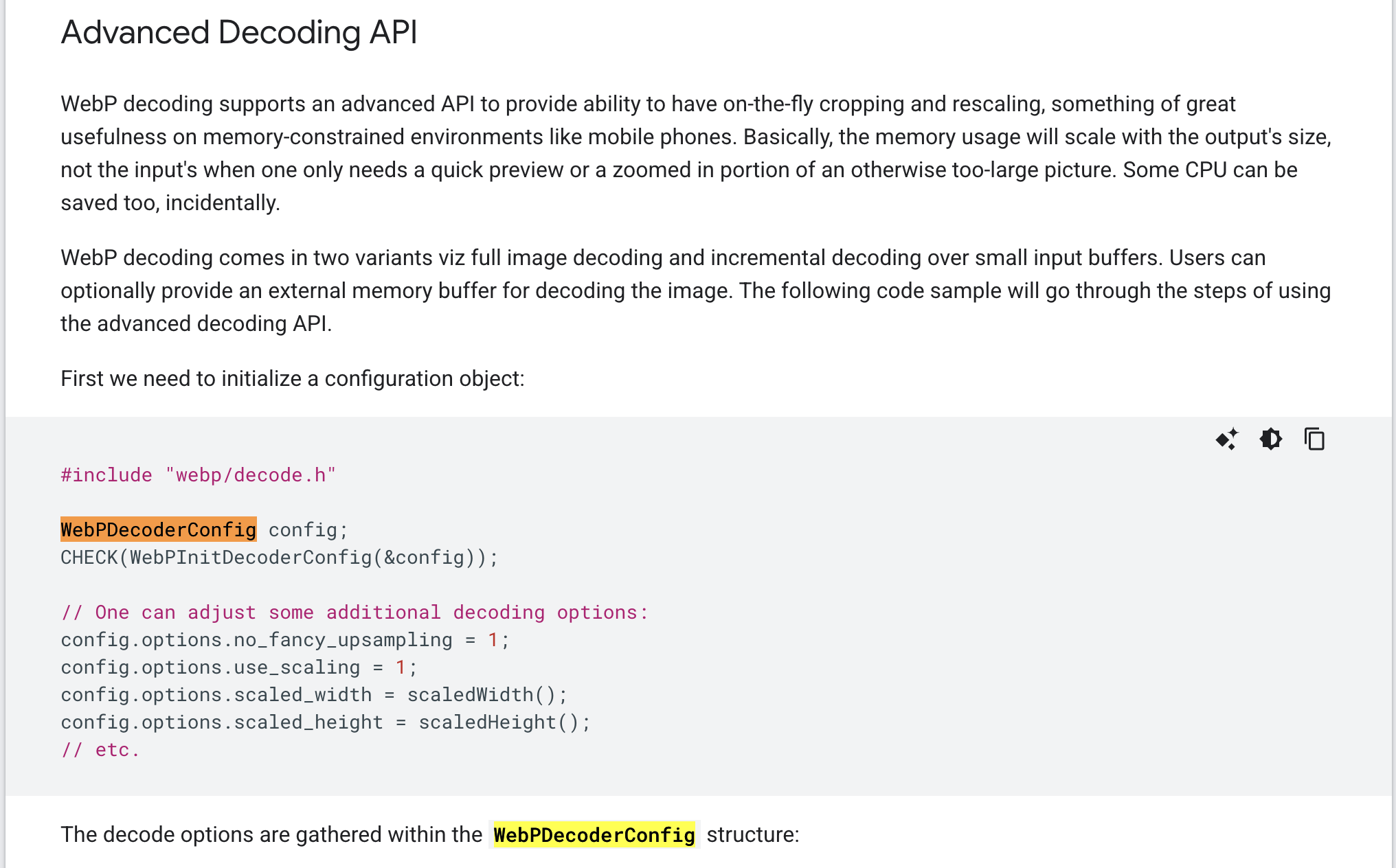 webp/decode.h exposes the decoder (incremental + one-shot) and config structs.