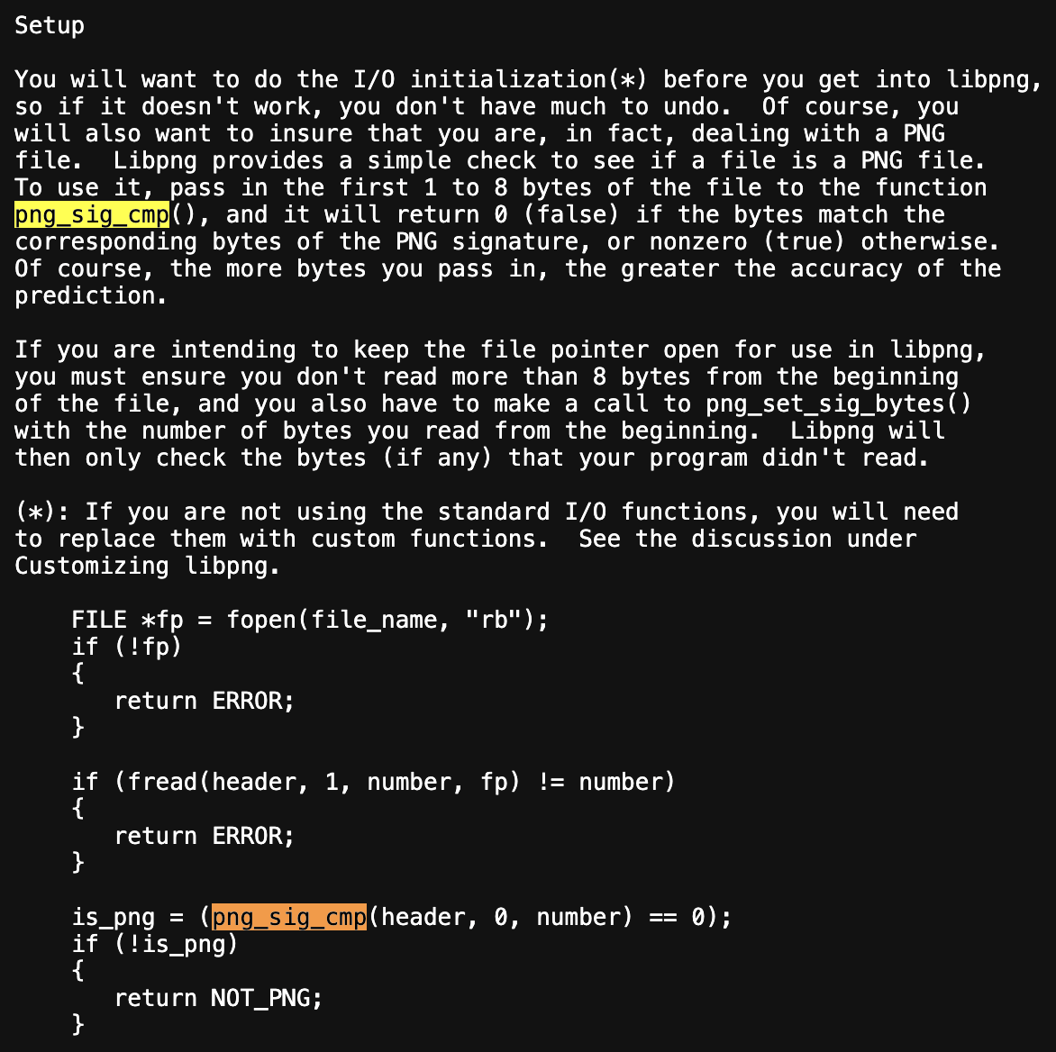 We're using libFuzzer as our fuzzer of choice because it runs in-process (in-memory) and is fast. To build a good harness, we first need to understand how to call the target APIs correctly, what a valid call looks like, required initialization, and cleanup. So we start by reading the libpng documentation and selecting the right functions to drive from our harness (see: libpng manual: https://www.libpng.org/pub/png/libpng-manual.txt)