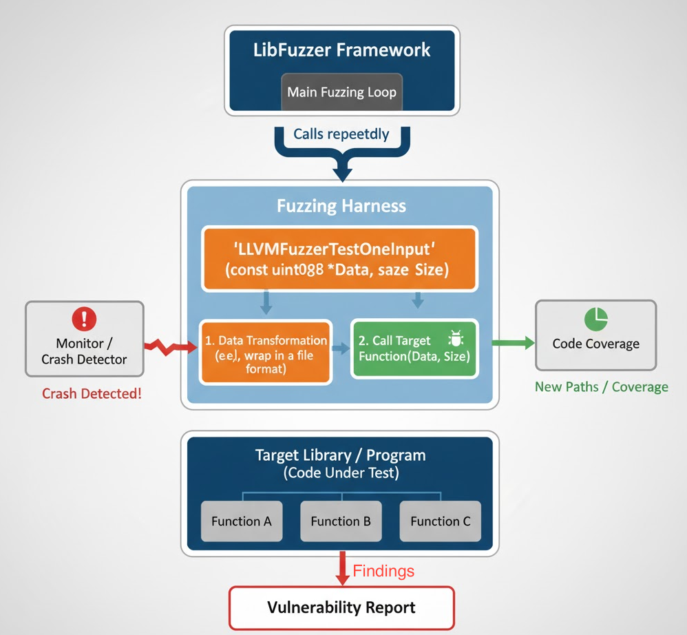 - Intelligent input mutation: The fuzzer uses feedback to prioritize inputs that increase coverage or trigger new behaviors.