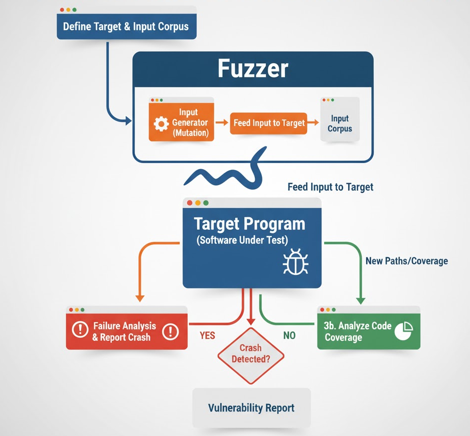 - Input mutation: Inputs are generated randomly or mutated based on predefined rules (e.g., flipping bits, inserting garbage data).