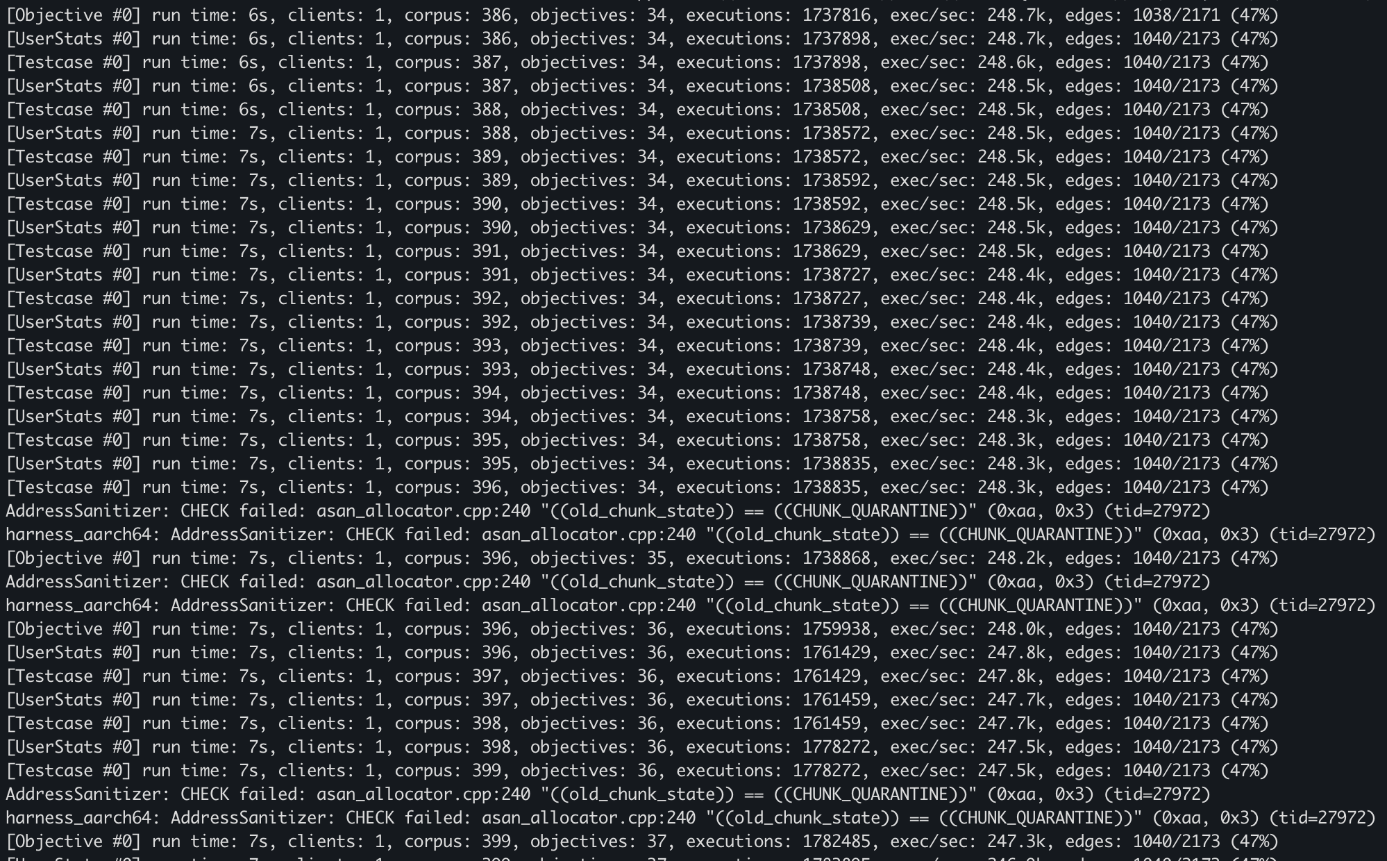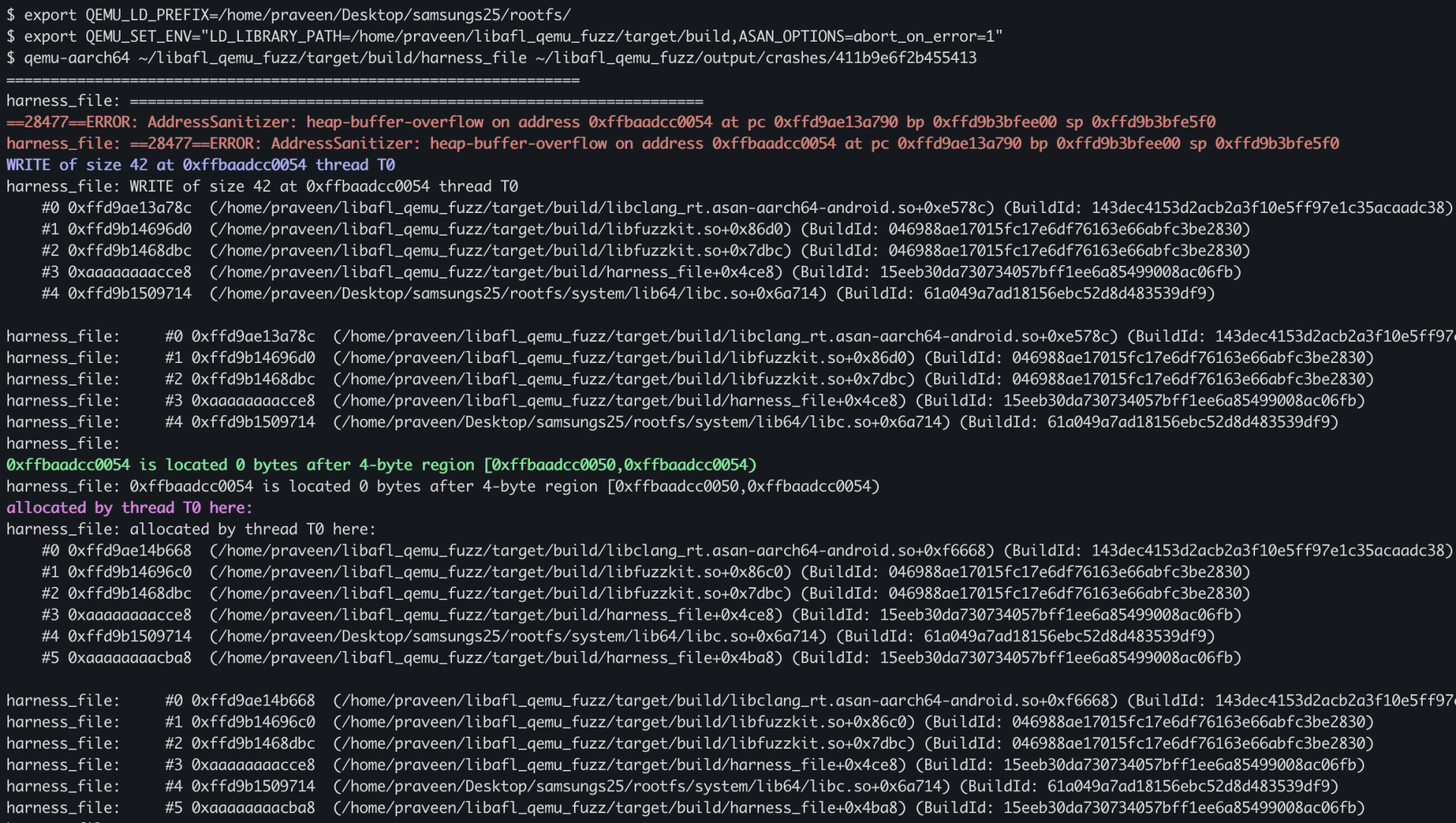 Now we’ll run the harness under QEMU user-mode to emulate the AArch64 binary and reproduce/check all the crashes.