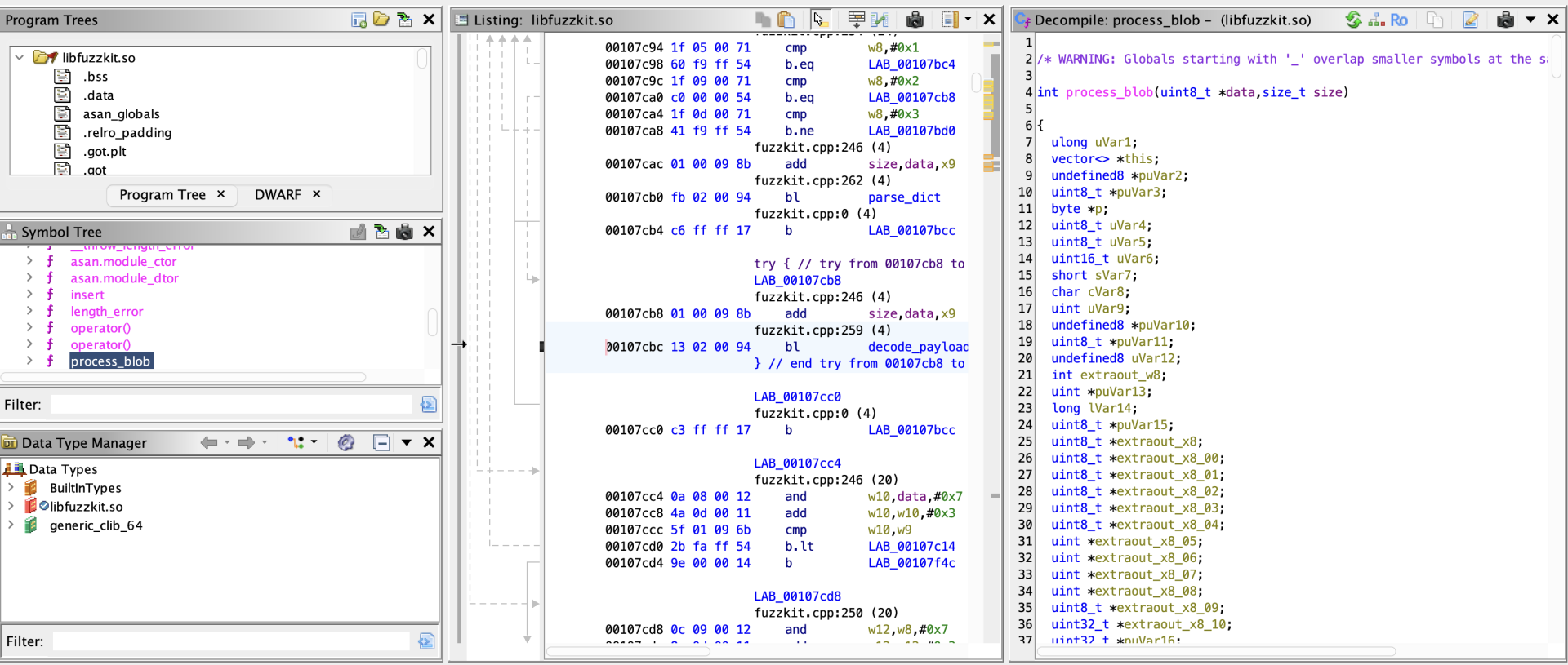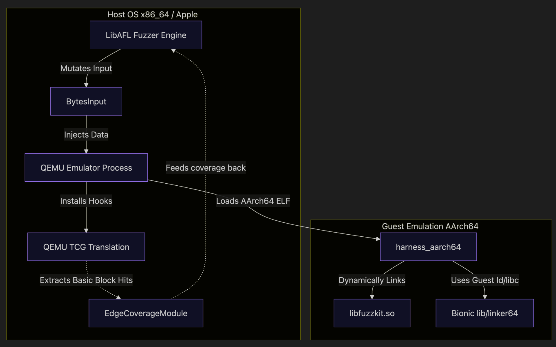- Harness(AArch64 ELF): calls into the library and exports `LLVMFuzzerTestOneInput`